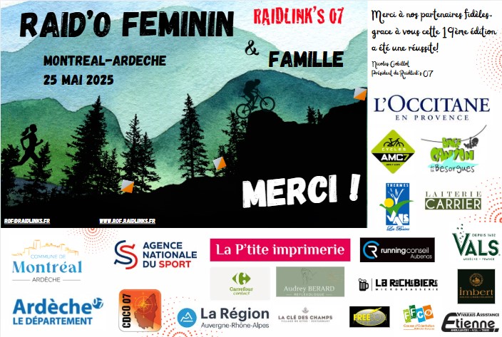 Merci à tous les partenaires qui nous ont soutenu pour cette organisation et bien entendu un énorme MERCI à tous les bénévoles, membres ou amis de Raidlink's 07, petits et grands, vous avez été parfaits, comme d'habitude!